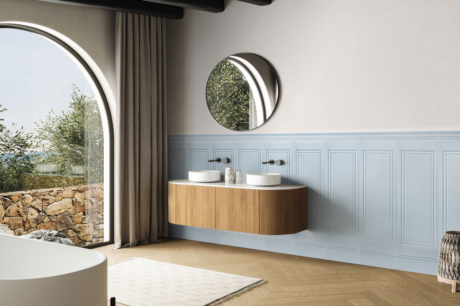 Diese Serie ist in einer breiten Palette von Pastellfarben erhältlich und besteht aus einem weißen Doppelfeuerträgern mit mattem Finish. Das klassische und klare Design erinnert sich an die traditionelle Boiserie.