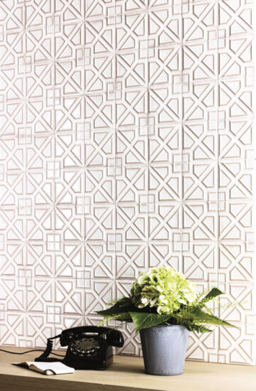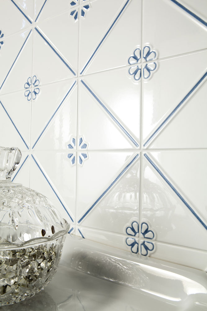 Wandfliesen aus weißer Masse in traditioneller Doppelbrand-Technik mit glänzender Oberfläche und Craquelé-Finish. Die Serie besteht aus 3 verschiedenen Reliefdekors, geeignet für kontrastbildend verzierte Wände. Im Format 13x13: Milano, modern gestaltetes dreidimensionales architektonisches Relief; Algarve, traditionelles Relief, und Anversa, inspiriert durch die klassische holländische Dekoration „Delft“.